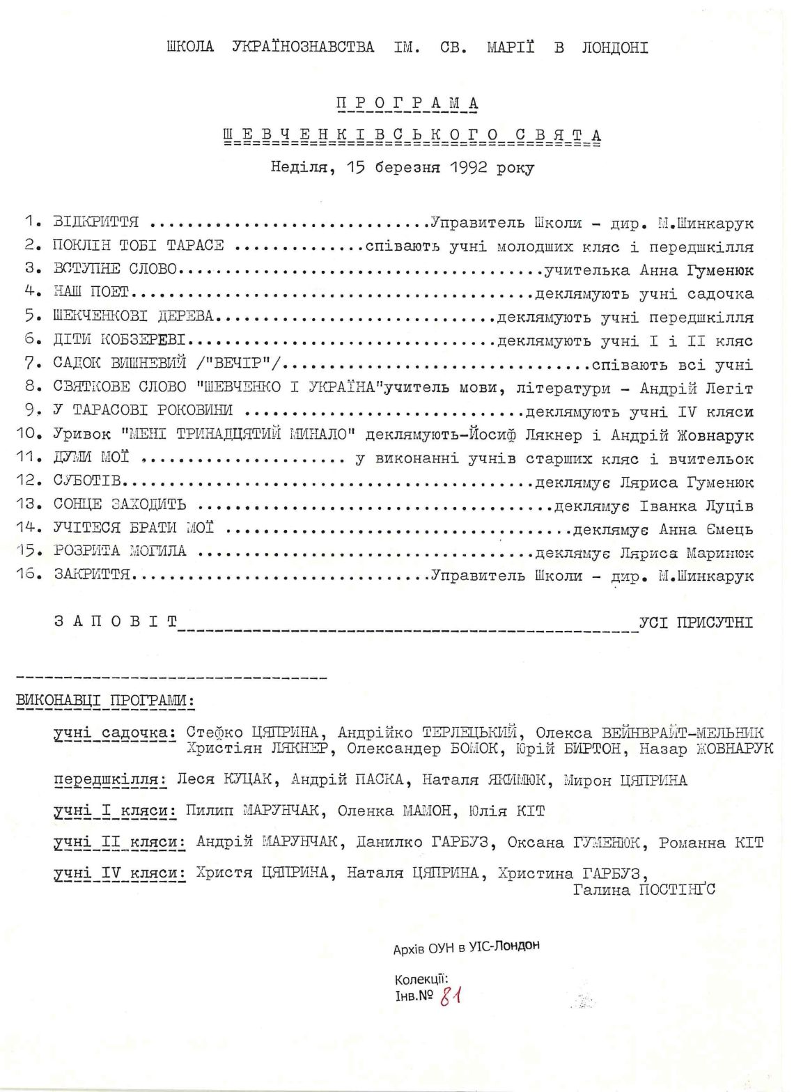 Програма Шевченківського свята при Школі Українознавства ім. Святої Марії в Лондоні.