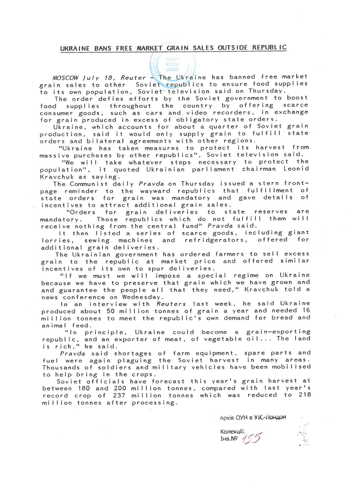 Повідомлення московського кореспондента Ройтерс про заборону вивезення збіжжя з України в липні 1991 р.