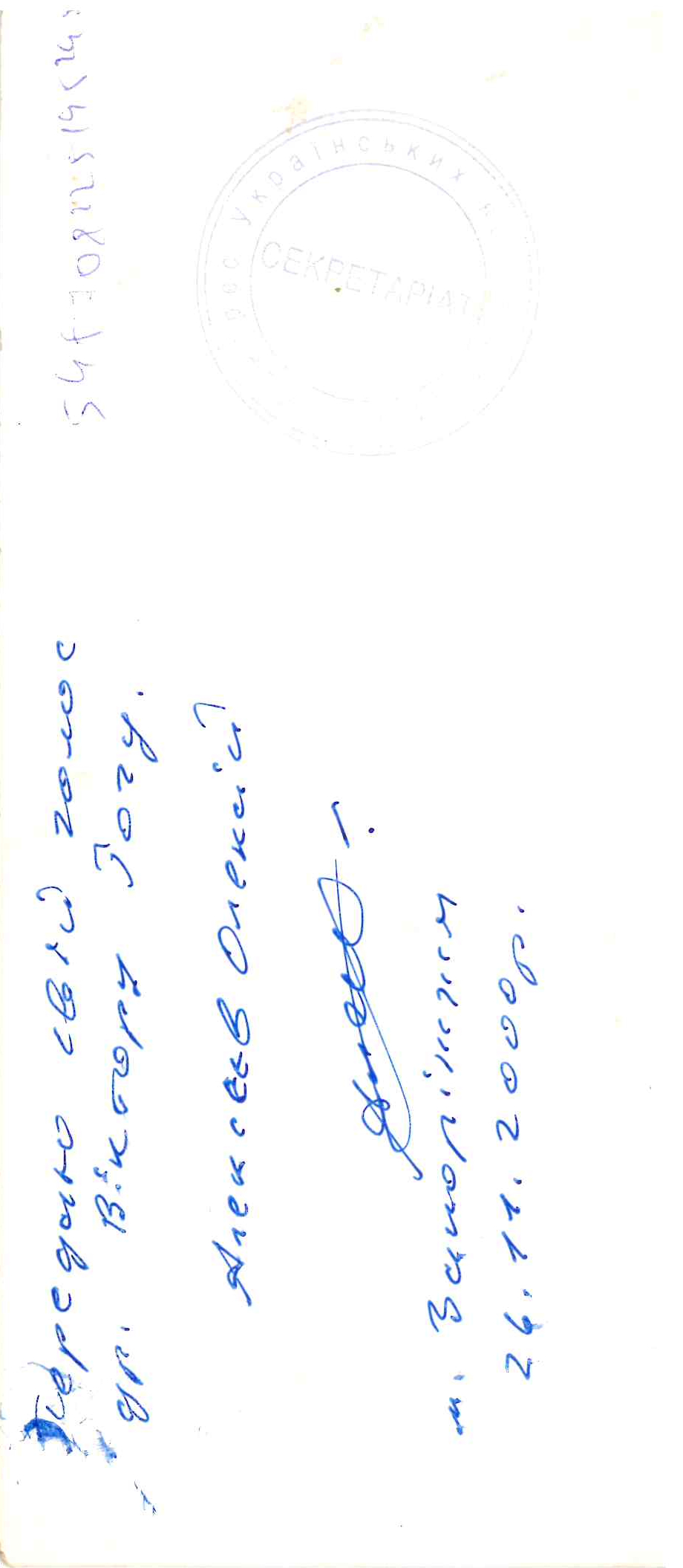 На звороті напис: “Передаю свій голос Віктору Рогу. Алексєєв Олексій. м.Запоріжжя. 26.11.2000”.