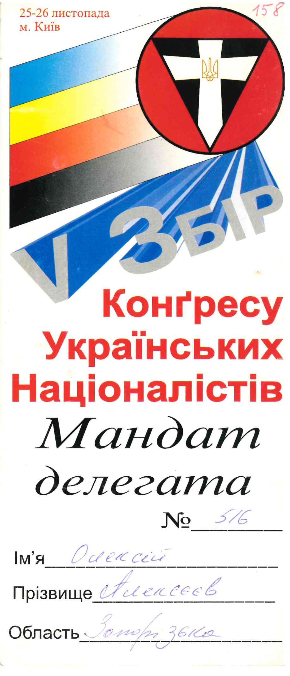 V Збір Конгресу Українських Націоналістів. Мандат делегата