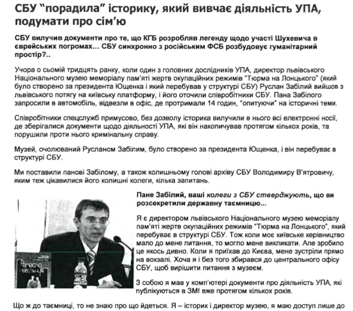 8 вересня 2010 року в Києві співробітники СБУ затримали і впродовж 14,5 годин допитували історика Руслана Забілого. Вони вилучили у нього ноутбук і два зовнішні харддиски. У цих носіях інформації, окрім наукових досліджень самого Руслана Забілого, містилися електронні копії історичних матеріалів та архівних документів.