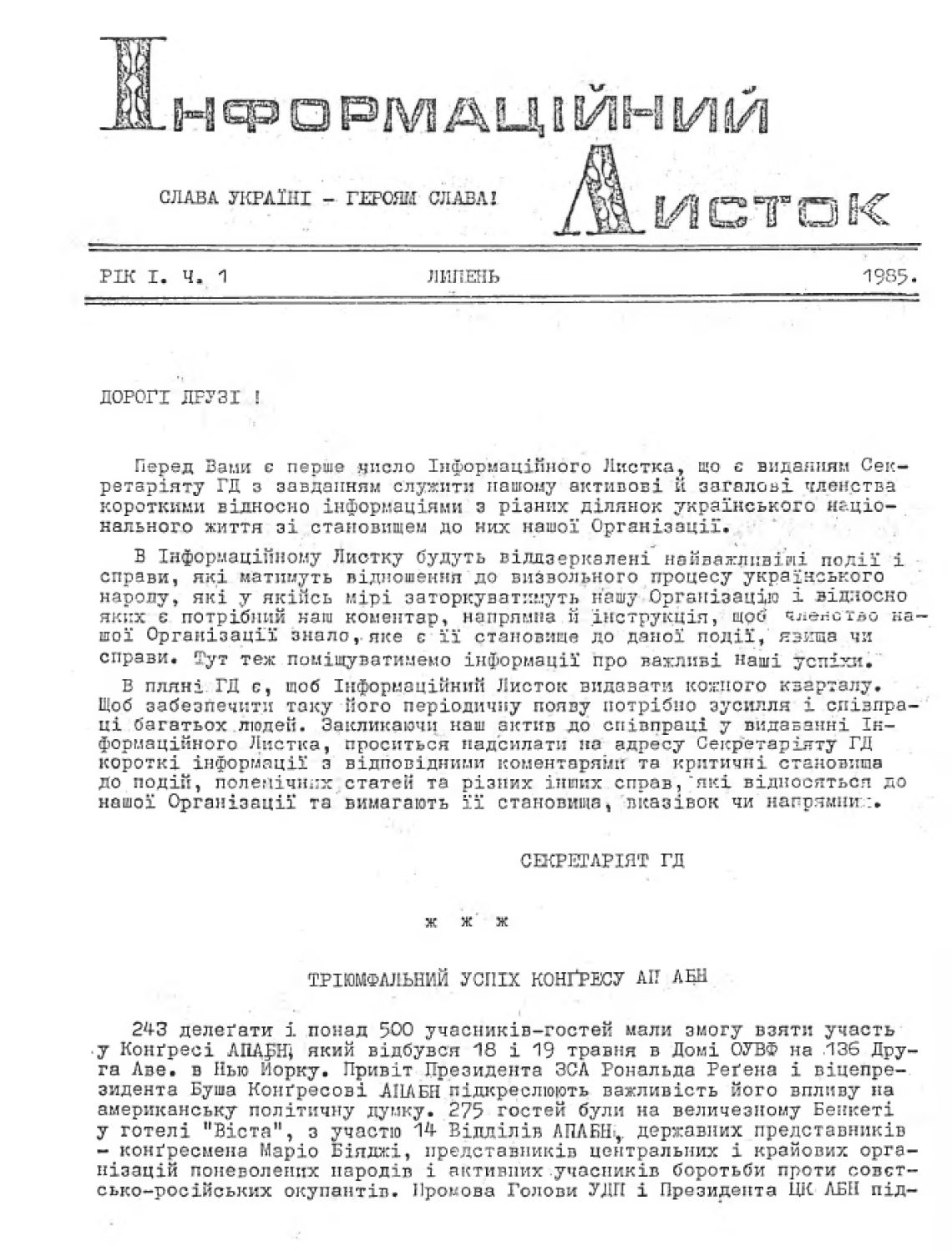 Матеріали Конференції Американських приятелів АБН у Вашингтоні 18-19 травня 1985 р.