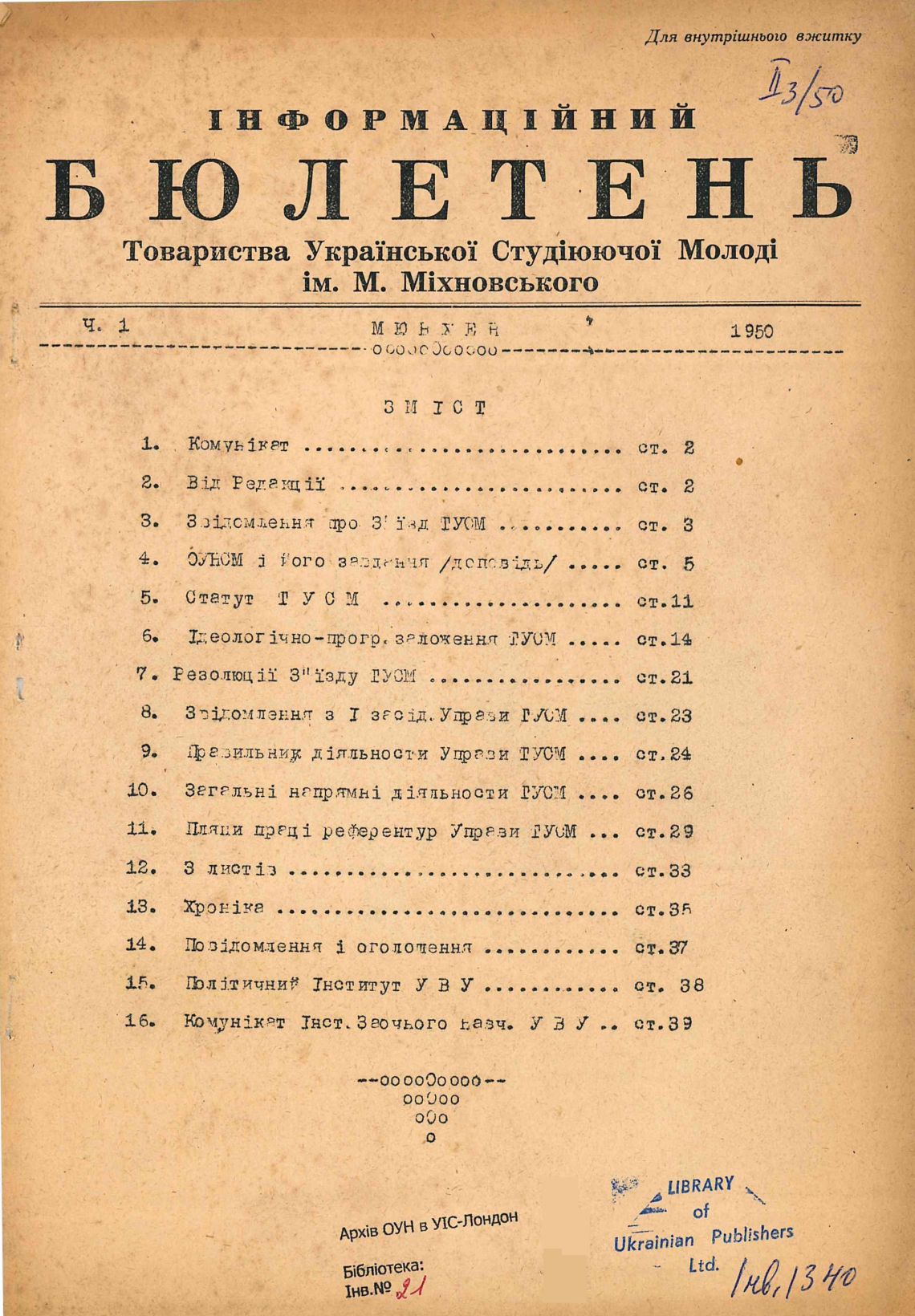 Бюлетень Всеукраїнського наукового та професійного Товариства української студіюючої молоді ім. М. Міхновського.