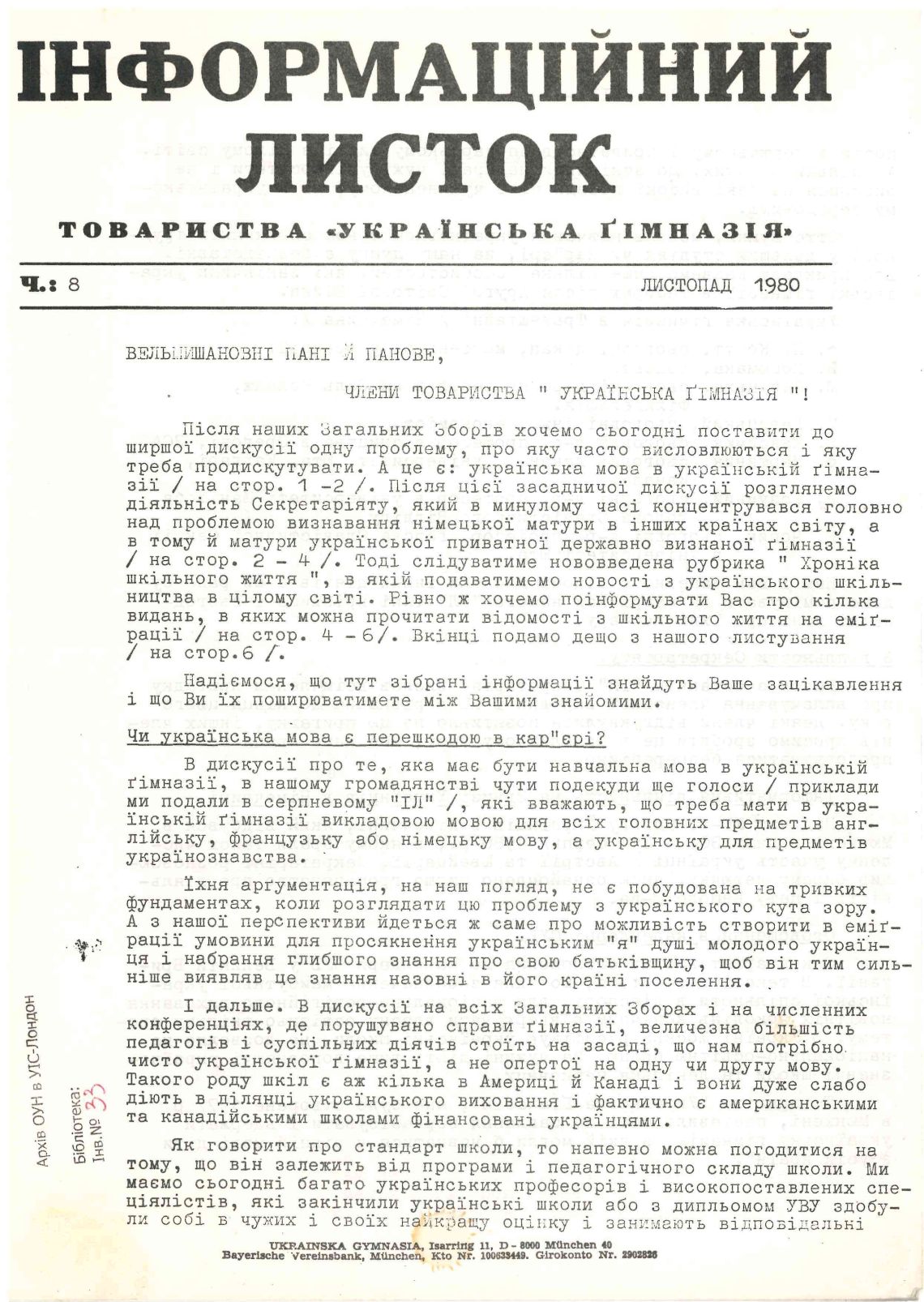 Інформаційний листок Товариства "Українська Гімназія"