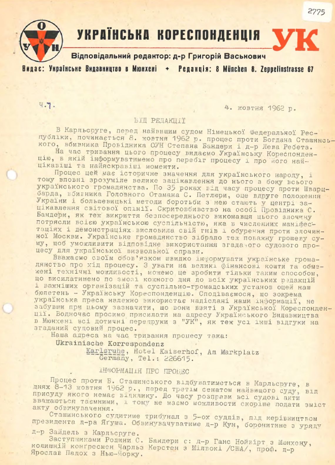 [Ukr.] "В Карльсруге, перед найвищим судом Німецької Федеральної Республіки, починається 8 жовтня 1962 р. процес проти Богдана Сташинського, вбивника Провідника ОУН Степана Бендери і д-р Лева Ребета. В час тривання цього процесу видаємо Українську Кореспонденцію, в якій інформуватимемо про перебіг процесу і про його найцікавіші та найяскравіші моменти".