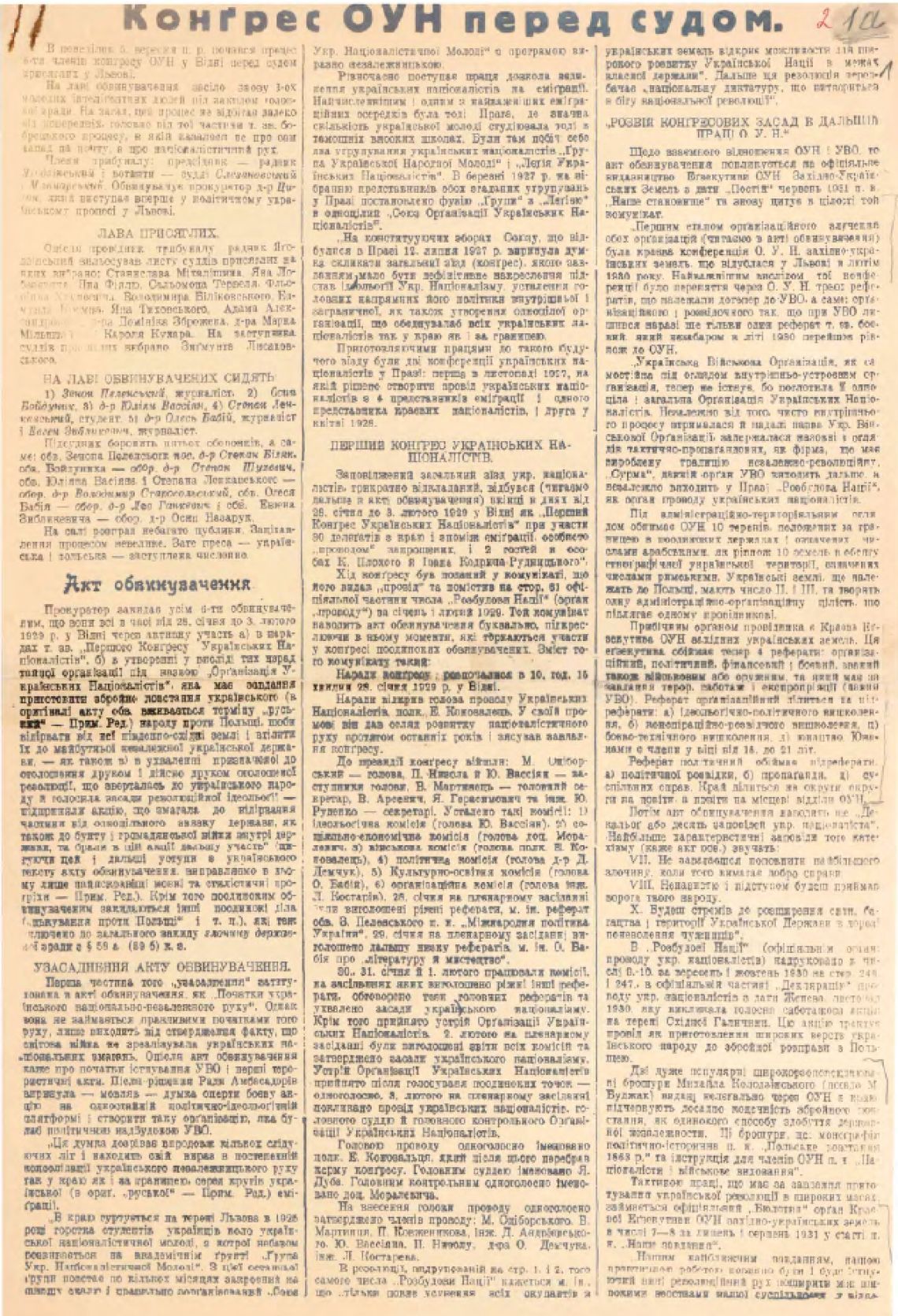 Фотокопії газети "Діло" від 07.09.1932 до 11.09.1932 з репортажами про судове засідання у Львові. На лаві підсудних: Зенон Пеленський, Осип Бойдуник, Юліан Вассиян, Степан Ленкавський, Олесь Бабій, Євген Зибликевич. Звинувачувались в участь в Конгресі Українських Націоналістів, який проходив у Відні з 28 січня по 3 лютого 1929 року.