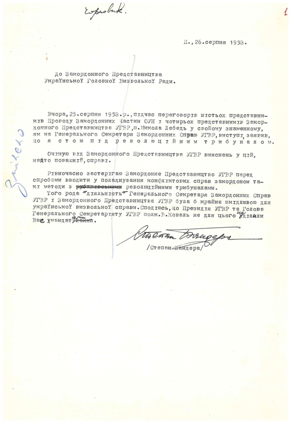 Чорновик звернення С. Бандери до Закордонного Представництва Української Головної Визвольної Ради.
