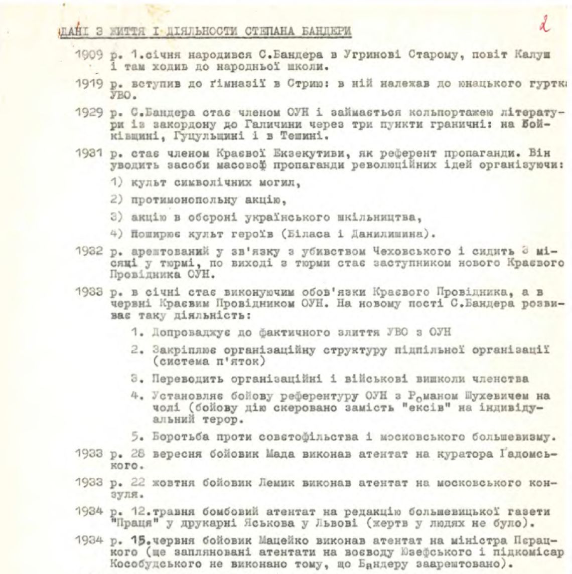 Документ являє собою хронологічний огляд основних подій життя та політичної діяльності Степана Бандери протягом 1909–1959 років. Він знаходився в архівній колекції інж. Василя Олеськіва