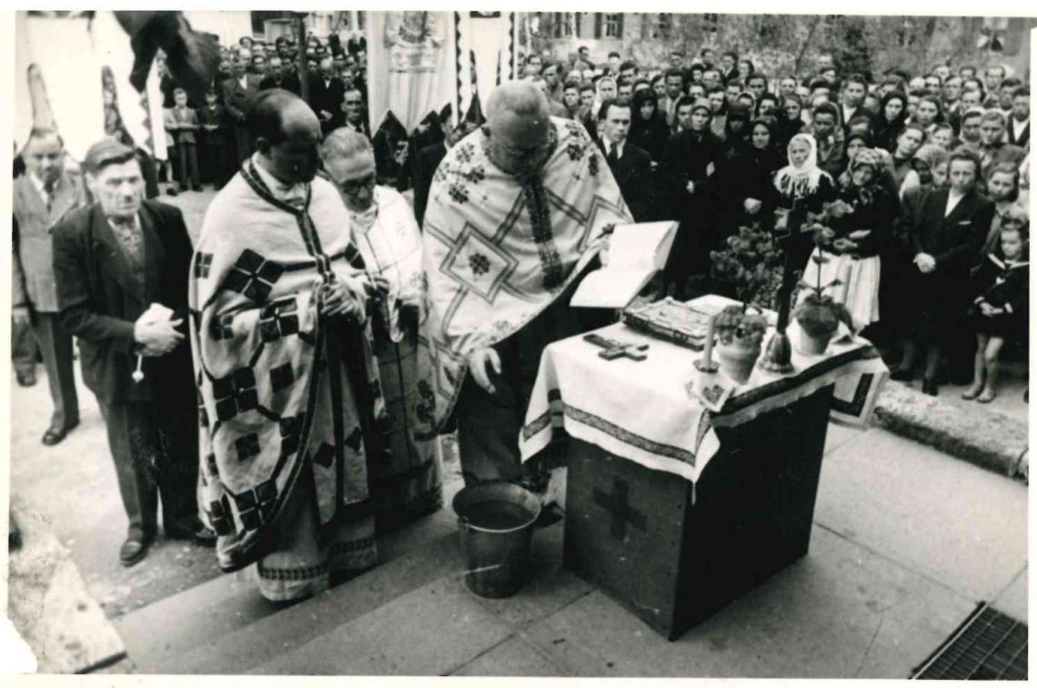 «Св. пам. Пор. Армії УГА і УНР декан Пилипець в асисті інших отців під час служби. Боже Тіло на площі. В Зоме касерне, Авсбург, Німеччина, рік 1947».