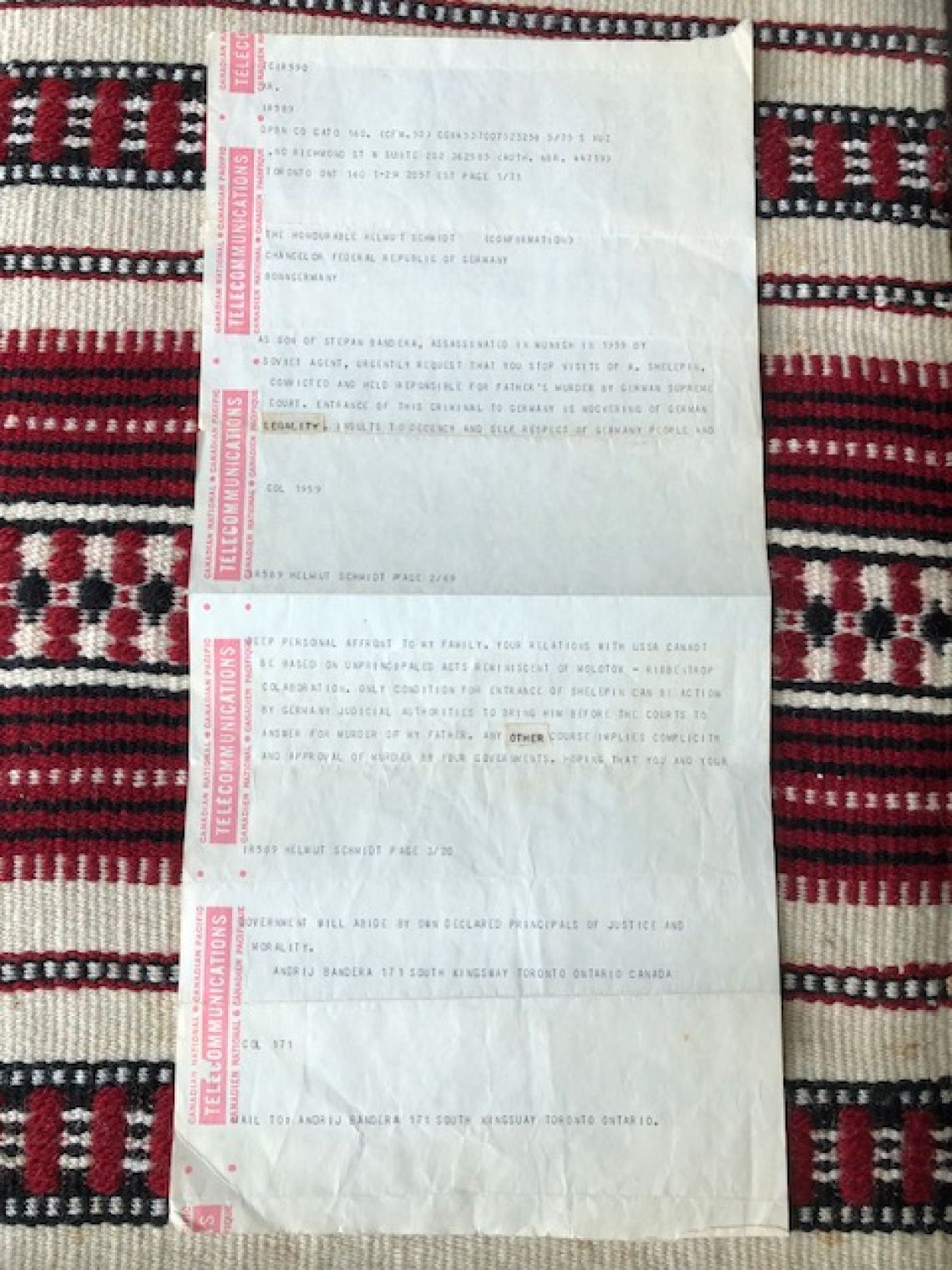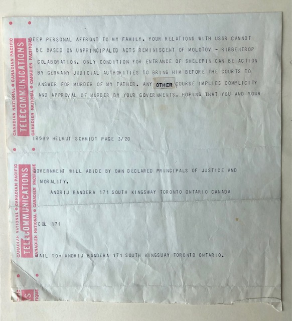 As son of Stepan Bandera, assassinated in Munich in 1959 by [a] Soviet agent, [I] urgently request that you stop [the] visits of A. Shelepin, [who was] convicted and held responsible for [my] father's murder by [the] German Supreme Court. Entrance of this criminal to Germany is mockering [sic] [mockery] of [the] German legality [legal system], insults to decency and self-respect of German people and [a] deep personal affront to my family. Your relations with [the] USSR cannot be based on unprincipled acts reminiscent of [the] Molotov-Ribbentrop collaboration. [The] only condition for entrance of Shelepin [to Germany] can be [the] action of German judicial authorities to bring him before the courts to answer for [the] murder of my father. Any other course implies complicity and approval of murder by your governments. Hoping that you and your government will abide by [your] own declared principals [sic] of justice and morality.