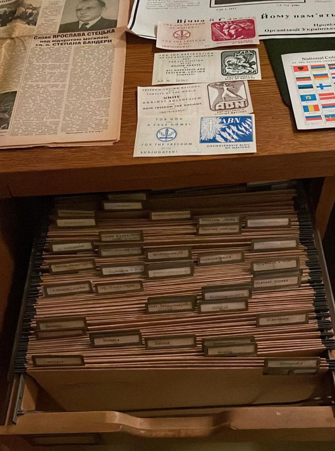 Відвідувачі музею часто звертають увагу на її вміст. Це течки (без документів), але з написами — за ними можна хоча б приблизно відтворити коло щоденних питань, якими займався Степан Бандера як Голова ОУН. Тут видно і внутрішню структуру Організації, її підрозділи й географію теренів по цілому світу, і розділи міжнародної політики, такі як АБН — Антибольшевицький Блок Народів, і сліди діалогу зі спорідненими середовищами та колишніми соратниками в боротьбі. Назви тек віддруковані на машинці й пронумеровані — від 71 до 110. Отже, насправді їх було більше.